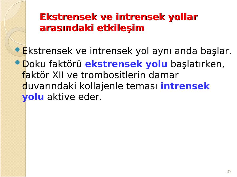 Ekstrensek ve intrensek yollar arasındaki etkileşim Ekstrensek ve intrensek yol aynı anda başlar. Doku faktörü ekstrensek yolu başlatırken, faktör XII ve trombositlerin damar duvarındaki kollajenle teması intrensek yolu aktive eder. 37