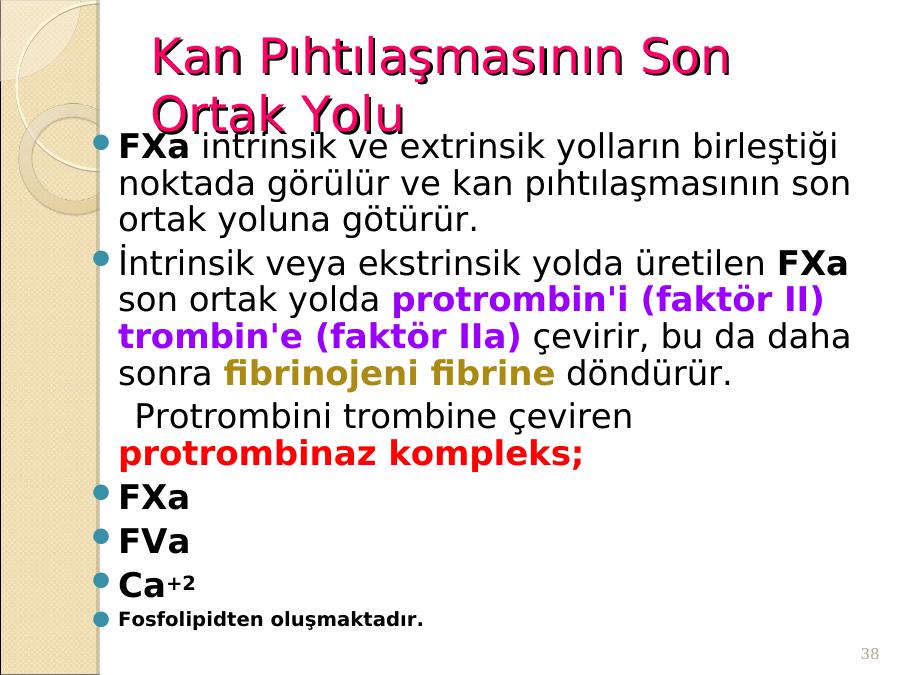 Kan Pıhtılaşmasının Son Ortak Yolu FXa intrinsik ve extrinsik yolların birleştiği noktada görülür ve kan pıhtılaşmasının son ortak yoluna götürür. İntrinsik veya ekstrinsik yolda üretilen FXa son ortak yolda protrombin'i (faktör II) trombin'e (faktör IIa) çevirir, bu da daha sonra fibrinojeni fibrine döndürür. Protrombini trombine çeviren protrombinaz kompleks; FXa FVa Ca+2 Fosfolipidten oluşmaktadır. 38