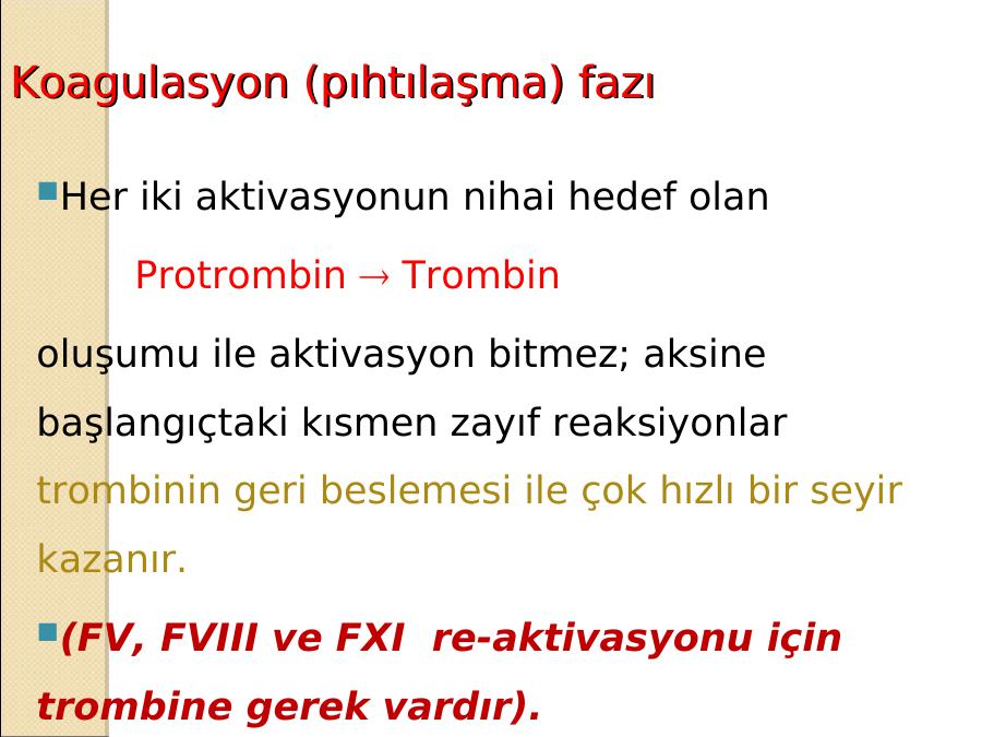 Her iki aktivasyonun nihai hedef olan Protrombin Trombin oluşumu ile aktivasyon bitmez; aksine başlangıçtaki kısmen zayıf reaksiyonlar trombinin geri beslemesi ile çok hızlı bir seyir kazanır. (FV, FVIII ve FXI re-aktivasyonu için trombine gerek vardır). Koagulasyon (pıhtılaşma) fazı