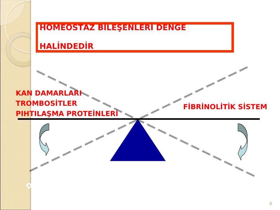 KAN DAMARLARI TROMBOSİTLER PIHTILAŞMA PROTEİNLERİ FİBRİNOLİTİK SİSTEM HOMEOSTAZ BİLEŞENLERİ DENGE HALİNDEDİR Da ma r iç i p ıht ıla şm a Kontrolsüz kanama 4