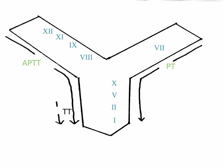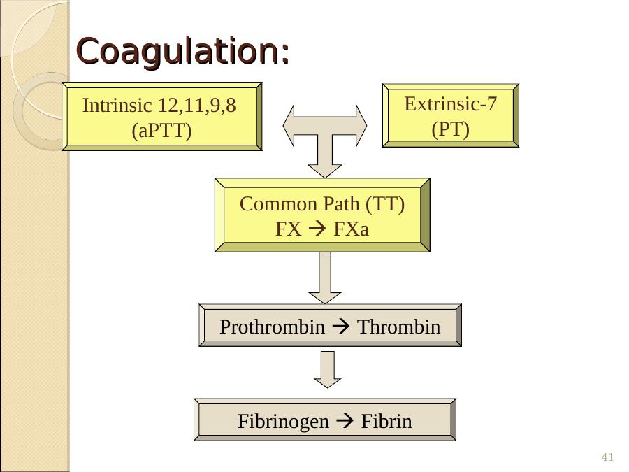 Coagulation: 41 Intrinsic 12,11,9,8 (aPTT) Extrinsic-7 (PT) Prothrombin Thrombin Fibrinogen Fibrin Common Path (TT) FX FXa