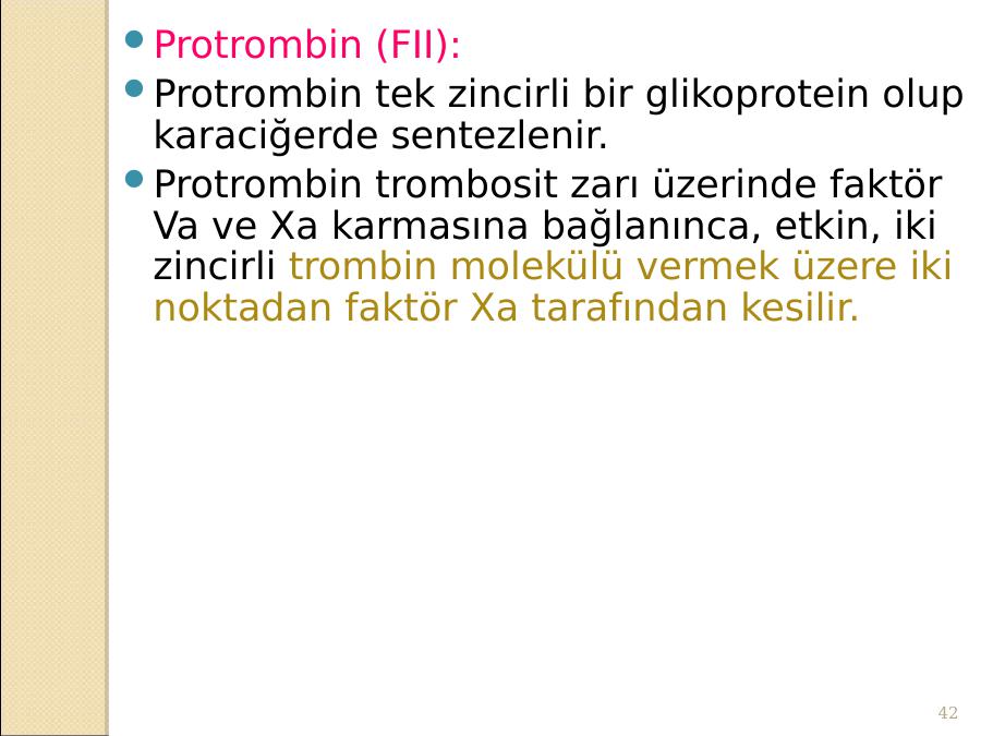 42 Protrombin (FII): Protrombin tek zincirli bir glikoprotein olup karaciğerde sentezlenir. Protrombin trombosit zarı üzerinde faktör Va ve Xa karmasına bağlanınca, etkin, iki zincirli trombin molekülü vermek üzere iki noktadan faktör Xa tarafından kesilir.
