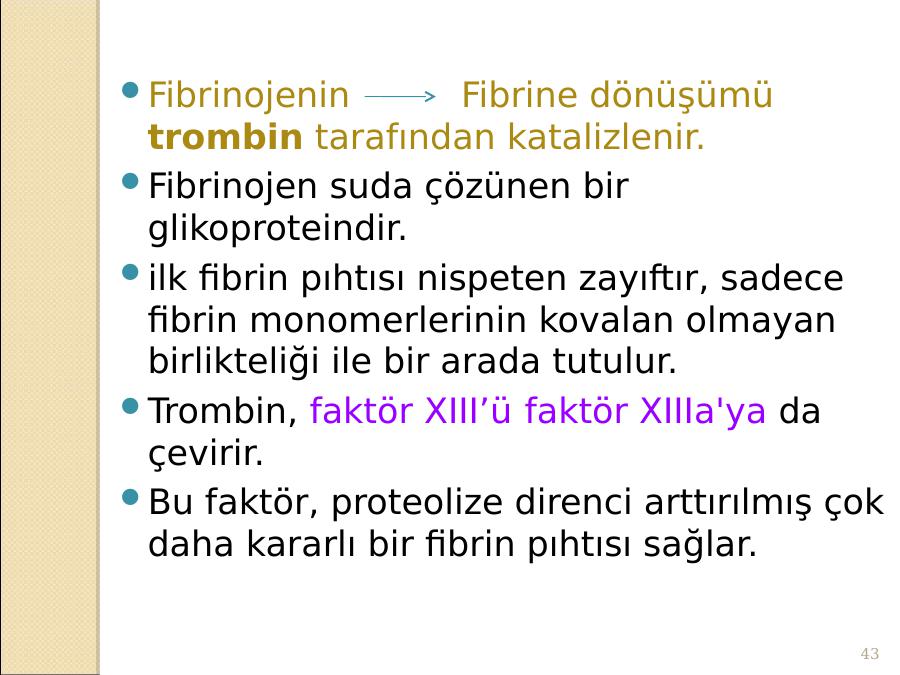 43 Fibrinojenin Fibrine dönüşümü trombin tarafından katalizlenir. Fibrinojen suda çözünen bir glikoproteindir. ilk fibrin pıhtısı nispeten zayıftır, sadece fibrin monomerlerinin kovalan olmayan birlikteliği ile bir arada tutulur. Trombin, faktör XIII’ü faktör XIIIa'ya da çevirir. Bu faktör, proteolize direnci arttırılmış çok daha kararlı bir fibrin pıhtısı sağlar.