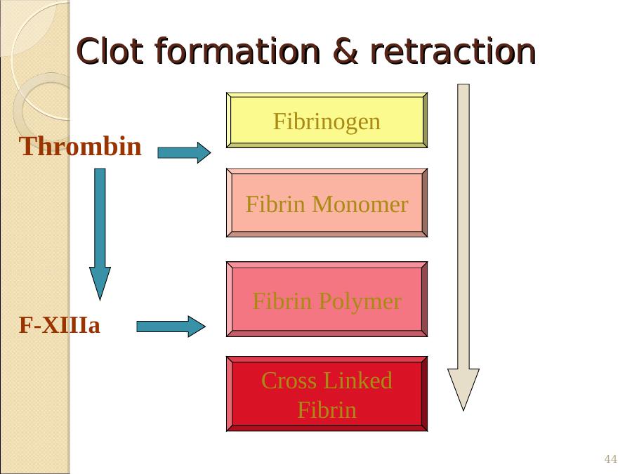 Clot formation & retraction 44 Fibrinogen Fibrin Monomer Fibrin Polymer Cross Linked Fibrin Thrombin F-XIIIa