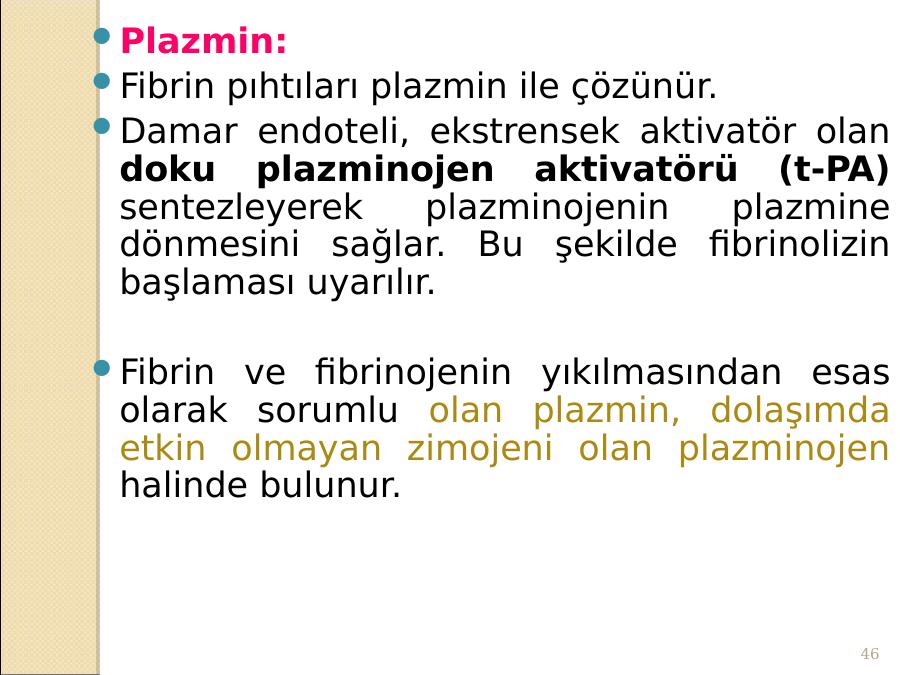 46 Plazmin: Fibrin pıhtıları plazmin ile çözünür. Damar endoteli, ekstrensek aktivatör olan doku plazminojen aktivatörü (t-PA) sentezleyerek plazminojenin plazmine dönmesini sağlar. Bu şekilde fibrinolizin başlaması uyarılır. Fibrin ve fibrinojenin yıkılmasından esas olarak sorumlu olan plazmin, dolaşımda etkin olmayan zimojeni olan plazminojen halinde bulunur.