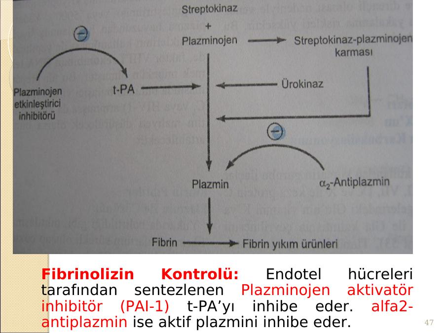 47 Fibrinolizin Kontrolü: Endotel hücreleri tarafından sentezlenen Plazminojen aktivatör inhibitör (PAI-1) t-PA’yı inhibe eder. alfa2- antiplazmin ise aktif plazmini inhibe eder.