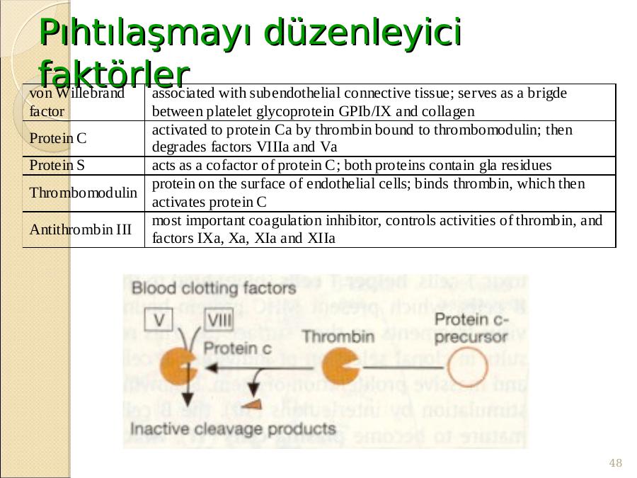 Pıhtılaşmayı düzenleyici faktörler von Willebrand factor associated with subendothelial connective tissue; serves as a brigde between platelet glycoprotein GPIb/IX and collagen Protein C activated to protein Ca by thrombin bound to thrombomodulin; then degrades factors VIIIa and Va Protein S acts as a cofactor of protein C; both proteins contain gla residues Thrombomodulin protein on the surface of endothelial cells; binds thrombin, which then activates protein C Antithrombin III most important coagulation inhibitor, controls activities of thrombin, and factors IXa, Xa, XIa and XIIa 48