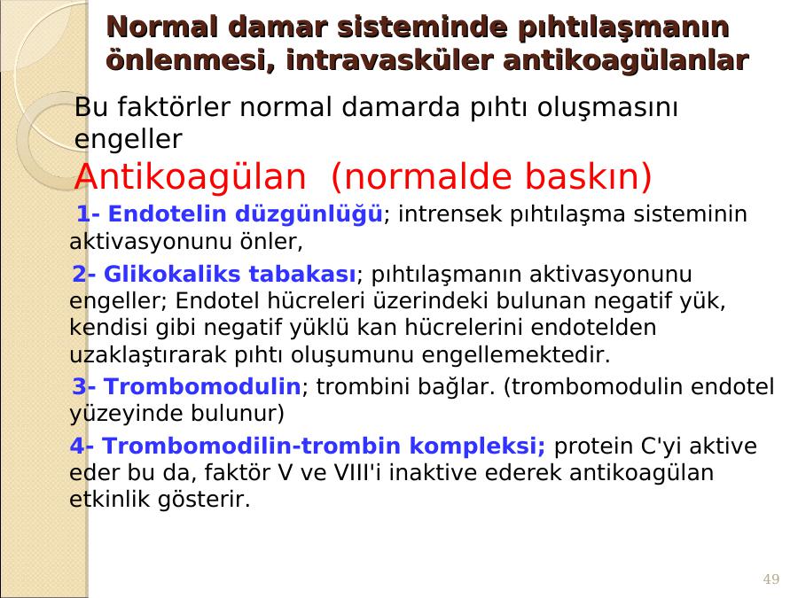 Normal damar sisteminde pıhtılaşmanın önlenmesi, intravasküler antikoagülanlar 1- Endotelin düzgünlüğü; intrensek pıhtılaşma sisteminin aktivasyonunu önler, 2- Glikokaliks tabakası; pıhtılaşmanın aktivasyonunu engeller; Endotel hücreleri üzerindeki bulunan negatif yük, kendisi gibi negatif yüklü kan hücrelerini endotelden uzaklaştırarak pıhtı oluşumunu engellemektedir. 3- Trombomodulin; trombini bağlar. (trombomodulin endotel yüzeyinde bulunur) 4- Trombomodilin-trombin kompleksi; protein C'yi aktive eder bu da, faktör V ve VIII'i inaktive ederek antikoagülan etkinlik gösterir. 49 Bu faktörler normal damarda pıhtı oluşmasını engeller Antikoagülan (normalde baskın)