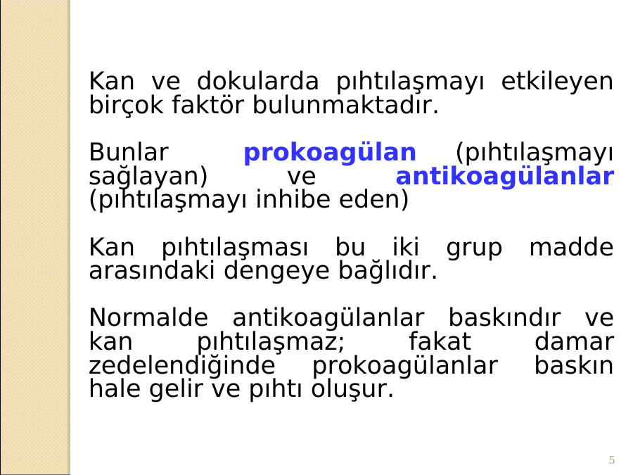 5 Kan ve dokularda pıhtılaşmayı etkileyen birçok faktör bulunmaktadır. Bunlar prokoagülan (pıhtılaşmayı sağlayan) ve antikoagülanlar (pıhtılaşmayı inhibe eden) Kan pıhtılaşması bu iki grup madde arasındaki dengeye bağlıdır. Normalde antikoagülanlar baskındır ve kan pıhtılaşmaz; fakat damar zedelendiğinde prokoagülanlar baskın hale gelir ve pıhtı oluşur.