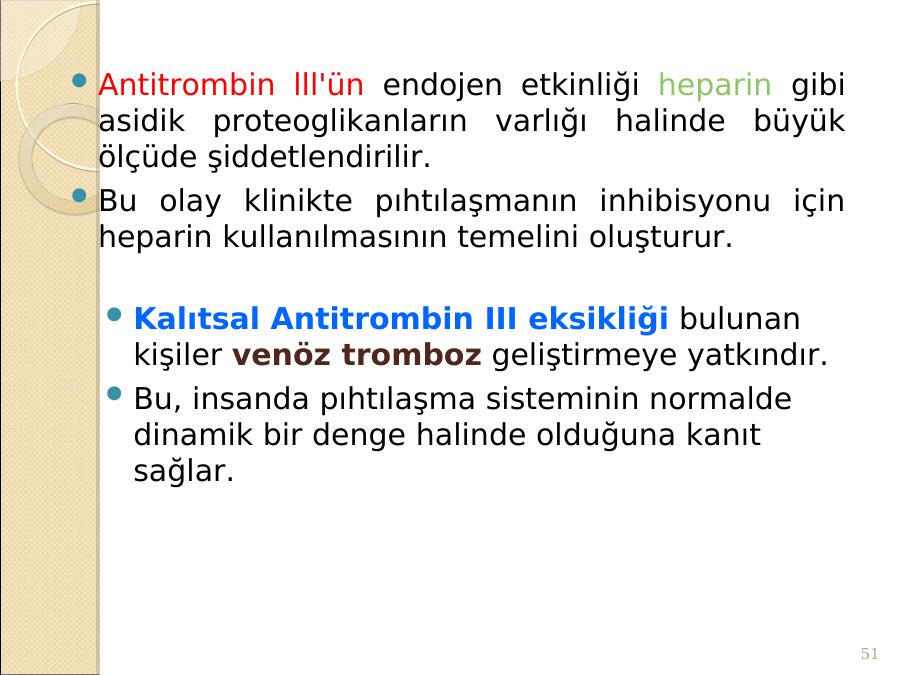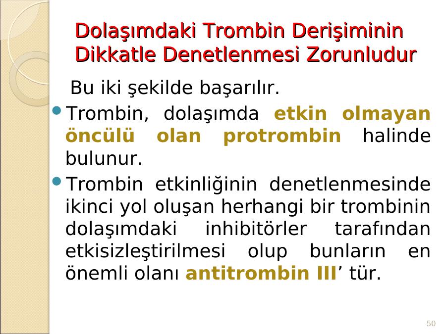 Dolaşımdaki Trombin Derişiminin Dikkatle Denetlenmesi Zorunludur Bu iki şekilde başarılır. Trombin, dolaşımda etkin olmayan öncülü olan protrombin halinde bulunur. Trombin etkinliğinin denetlenmesinde ikinci yol oluşan herhangi bir trombinin dolaşımdaki inhibitörler tarafından etkisizleştirilmesi olup bunların en önemli olanı antitrombin III’ tür. 50