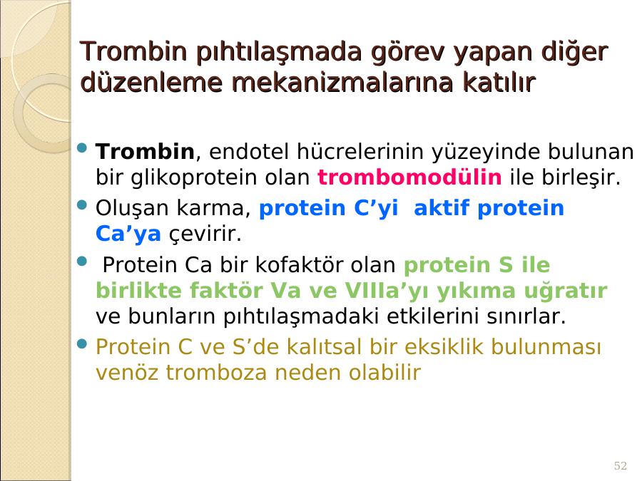 Trombin pıhtılaşmada görev yapan diğer düzenleme mekanizmalarına katılır Trombin, endotel hücrelerinin yüzeyinde bulunan bir glikoprotein olan trombomodülin ile birleşir. Oluşan karma, protein C’yi aktif protein Ca’ya çevirir. Protein Ca bir kofaktör olan protein S ile birlikte faktör Va ve VIIIa’yı yıkıma uğratır ve bunların pıhtılaşmadaki etkilerini sınırlar. Protein C ve S’de kalıtsal bir eksiklik bulunması venöz tromboza neden olabilir 52