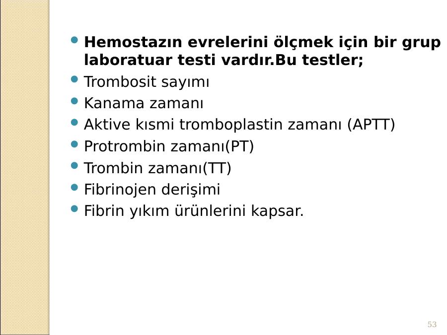 53 Hemostazın evrelerini ölçmek için bir grup laboratuar testi vardır.Bu testler; Trombosit sayımı Kanama zamanı Aktive kısmi tromboplastin zamanı (APTT) Protrombin zamanı(PT) Trombin zamanı(TT) Fibrinojen derişimi Fibrin yıkım ürünlerini kapsar.