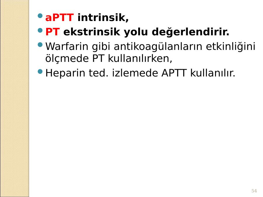 54 aPTT intrinsik, PT ekstrinsik yolu değerlendirir. Warfarin gibi antikoagülanların etkinliğini ölçmede PT kullanılırken, Heparin ted. izlemede APTT kullanılır.