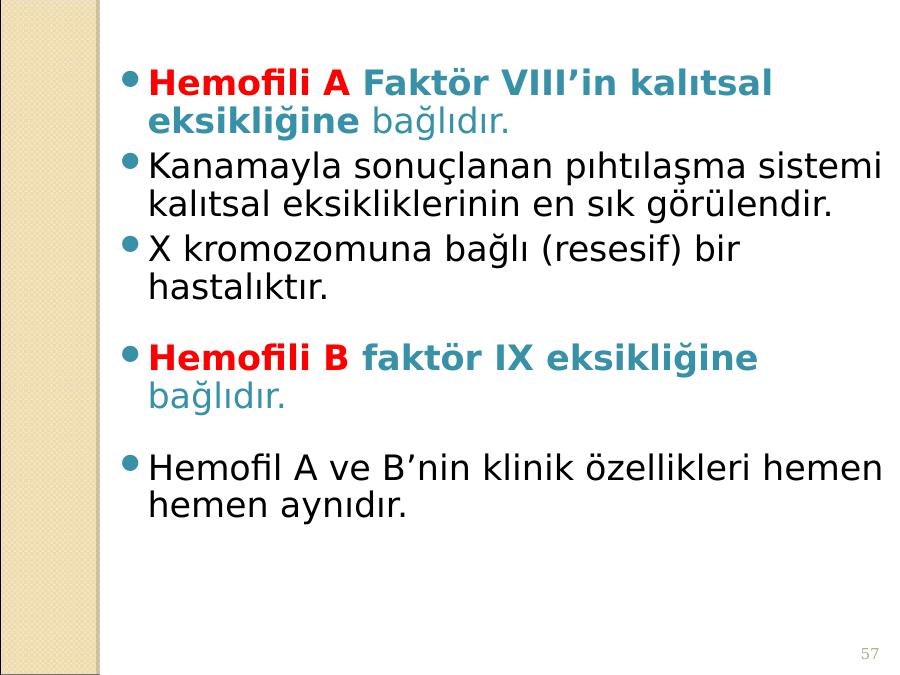57 Hemofili A Faktör VIII’in kalıtsal eksikliğine bağlıdır. Kanamayla sonuçlanan pıhtılaşma sistemi kalıtsal eksikliklerinin en sık görülendir. X kromozomuna bağlı (resesif) bir hastalıktır. Hemofili B faktör IX eksikliğine bağlıdır. Hemofil A ve B’nin klinik özellikleri hemen hemen aynıdır.