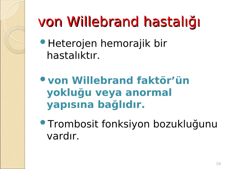von Willebrand hastalığı Heterojen hemorajik bir hastalıktır. von Willebrand faktör’ün yokluğu veya anormal yapısına bağlıdır. Trombosit fonksiyon bozukluğunu vardır. 58