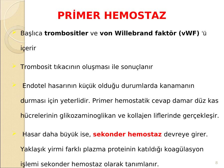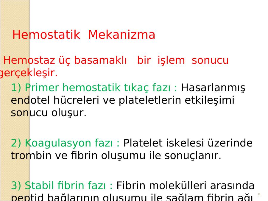 PRİMER HEMOSTAZ Başlıca trombositler ve von Willebrand faktör (vWF) ‘ü içerir Trombosit tıkacının oluşması ile sonuçlanır Endotel hasarının küçük olduğu durumlarda kanamanın durması için yeterlidir. Primer hemostatik cevap damar düz kas hücrelerinin glikozaminoglikan ve kollajen liflerinde gerçekleşir. Hasar daha büyük ise, sekonder hemostaz devreye girer. Yaklaşık yirmi farklı plazma proteinin katıldığı koagülasyon işlemi sekonder hemostaz olarak tanımlanır. 8