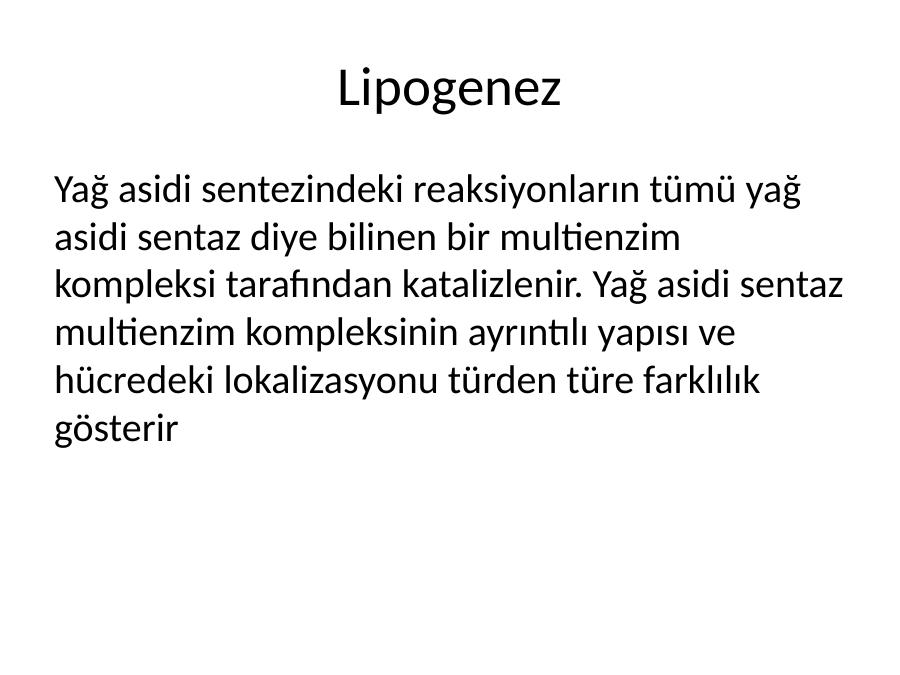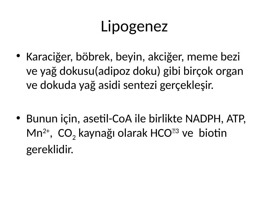 Lipogenez• Karaciğer, böbrek, beyin, akciğer, meme bezi ve yağ dokusu(adipoz doku) gibi birçok organ ve dokuda yağ asidi sentezi gerçekleşir.• Bunun için, asetil-CoA ile birlikte NADPH, ATP, Mn2+, CO2 kaynağı olarak HCO3 ve biotin gereklidir.