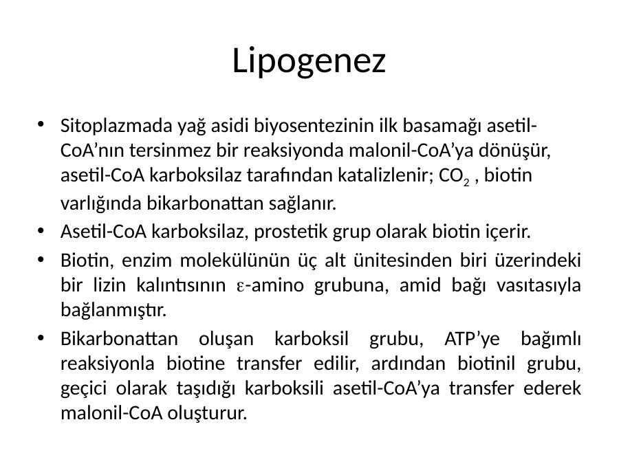 Lipogenez• Sitoplazmada yağ asidi biyosentezinin ilk basamağı asetil-CoA’nın tersinmez bir reaksiyonda malonil-CoA’ya dönüşür, asetil-CoA karboksilaz tarafından katalizlenir; CO2 , biotin varlığında bikarbonattan sağlanır.• Asetil-CoA karboksilaz, prostetik grup olarak biotin içerir. • Biotin, enzim molekülünün üç alt ünitesinden biri üzerindeki bir lizin kalıntısının -amino grubuna, amid bağı vasıtasıyla bağlanmıştır. • Bikarbonattan oluşan karboksil grubu, ATP’ye bağımlı reaksiyonla biotine transfer edilir, ardından biotinil grubu, geçici olarak taşıdığı karboksili asetil-CoA’ya transfer ederek malonil-CoA oluşturur.