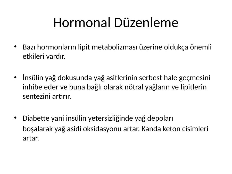 Hormonal Düzenleme• Bazı hormonların lipit metabolizması üzerine oldukça önemli etkileri vardır.• İnsülin yağ dokusunda yağ asitlerinin serbest hale geçmesini inhibe eder ve buna bağlı olarak nötral yağların ve lipitlerin sentezini artırır. • Diabette yani insülin yetersizliğinde yağ depolarıboşalarak yağ asidi oksidasyonu artar. Kanda keton cisimleri artar.
