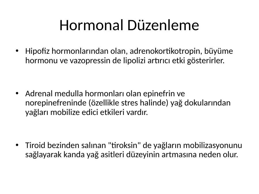 Hormonal Düzenleme• Hipofiz hormonlarından olan, adrenokortikotropin, büyüme hormonu ve vazopressin de lipolizi artırıcı etki gösterirler.• Adrenal medulla hormonları olan epinefrin ve norepinefreninde (özellikle stres halinde) yağ dokularından yağları mobilize edici etkileri vardır.• Tiroid bezinden salınan \tiroksin\ de yağların mobilizasyonunu sağlayarak kanda yağ asitleri düzeyinin artmasına neden olur.